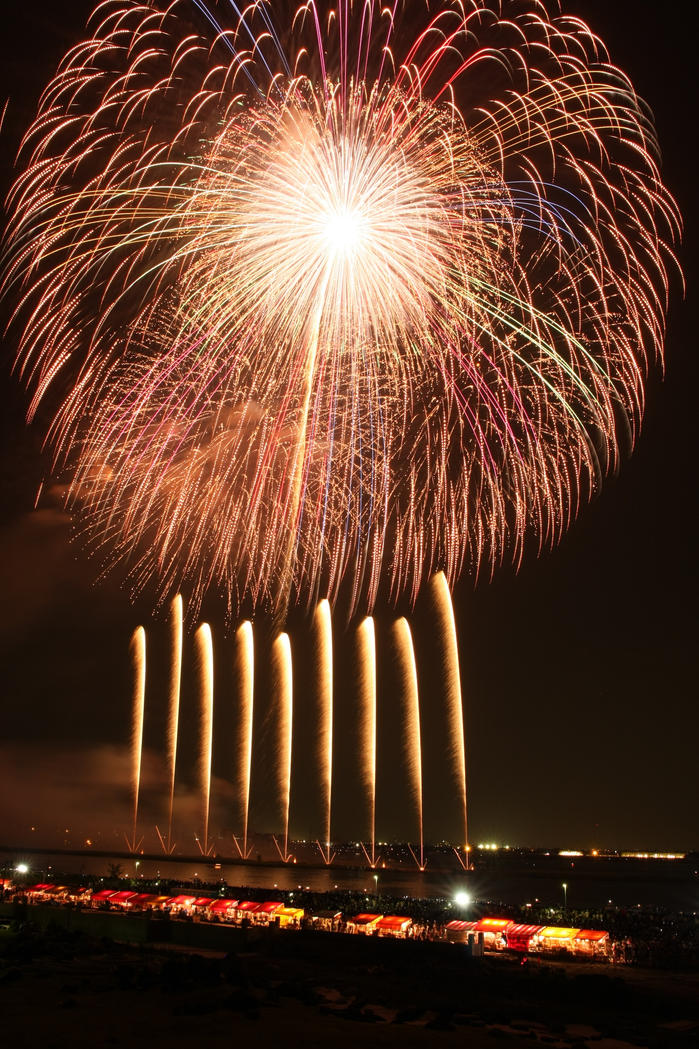 - 昭和9年に始められた伝統ある桑名水郷花火大会は長良川と揖斐川の間にある中洲の島から打ち上げられます。川面に写る色とりどりの花火の明かりもまた綺麗です。